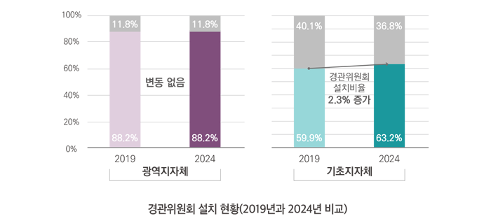 광역지자체 중 경관위원회를 설치한 지자체는 15곳(88.2%)이며, 별도의 경관위원회를 구성하지 않고 관련 위원회가 이를 대체하고 있는 지자체는 2곳(서울, 충북)이다. 기초지자체 중 경관위원회를 설치한 지자체는 134곳(63.2%), 관련 위원회로 대체하여 심의를 진행하고 있거나 경관위원회를 설치하지 않은 지자체는 78곳(36.8%)이다.