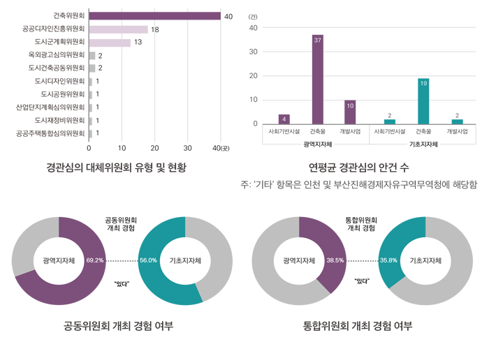 경관위원회를 설치하지 않고 관련 위원회에서 그 역할을 대체하는 경우 건축위원회(40곳), 공공디자인진흥위원회(18곳), 도시·군계획위원회(13곳)가 이를 담당하는 경우가 많은 것으로 나타났다. 이는 경관심의 대상 중 건축물이 가장 큰 비중을 차지하는 만큼, 건축위원회가 경관위원회를 대신하는 경우가 많은 것으로 파악되었다. 최근 공동 또는 통합위원회를 개최하는 지자체가 증가하고 있는데, 경관위원회와 타 위원회를 동시에 개최하는 ‘공동위원회’는 57%의 지자체가, 광역지자체의 경우 69.2%가 경험하였다고 응답하였다. 특히 경관위원회 없이 경관심의를 타 위원회에 통합하여 개최하는 ‘통합위원회’는 전체의 35.6%가 경험한 것으로 조사되었다.