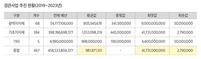 최근 5년간(2019~2023년) 지자체에서 추진한 경관사업 건수는 광역지자체 68건, 기초지자체 394 건, 기타 5건으로 조사되었으며, 경관사업 1건당 평균 예산은 약 9억 8,000만 원으로 조사되었으나, 최소 280만 원에서부터 최대 417억 원으로 사업 특성별로 격차가 매우 큰 것을 알 수 있었다.