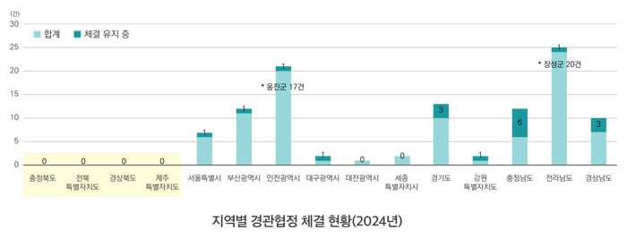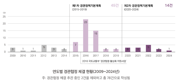 경관협정 제도가 국내 도입된 이후 총 80건이 체결되었으며, 현재 체결 유지 중인 것은 18건 으로 파악되었다. 지역에 따라 협정 체결 현황이 크게 차이가 나는데, 경관협정 체결 사례가 없는 지자체는 4곳(충청북도, 전북특별자치도, 경상북도, 제주특별자치도)이며, 체결 건이 많은 지자체는 전라남도 장성군(20건)과 인천 옹진군(17건)이다.