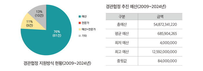 경관협정 체결 시 지자체는 예산과 전문가를 지원할 수 있는데 대부분(76%)이 예산 지원에 그치고 있으며, 예산은 평균 약 6억 8,500만 원을 지원하고 있는 것으로 조사되었다. 예산 규모는 최저 400만 원부터 최고 125억 원까지 격차가 매우 크며, 중윗값을 기준으로 보면 약 8,400만 원 정도로 나타났다. 예산 규모가 큰 경관협정의 경우, 협정 자체보다는 협정 체결 이후 경관사업 시행을 위한 예산이 포함되어 있었다. 경관협정의 평균 유효기간은 4.4년으로, 최단 1년에서 최장 10년이며 일반적으로는 5년5) 정도의 기간을 설정하였다.
