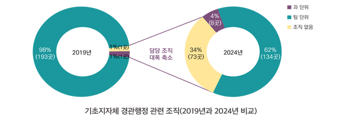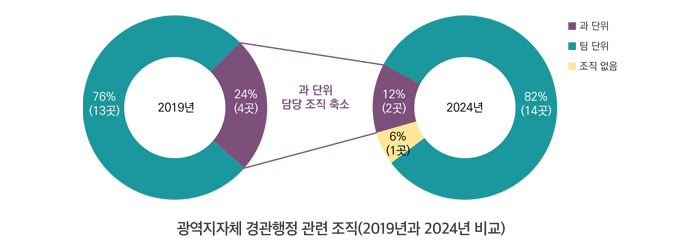 경관 업무를 수행하는 행정조직은 주로 팀 단위로 구성되어 있으며, 조직이 아예 부재한 경우도 있다. 독립부서(과 단위)로 운영되는 지자체는 광역 2곳, 기초 8곳으로 나타났다. 2019년과 비교해 볼 때 광역지자체와 기초지자체 모두 경관 담당 조직이 축소되었으며, 특히 기초지자체의 경우는 조직이 부재한 경우가 34%로 나타났다.