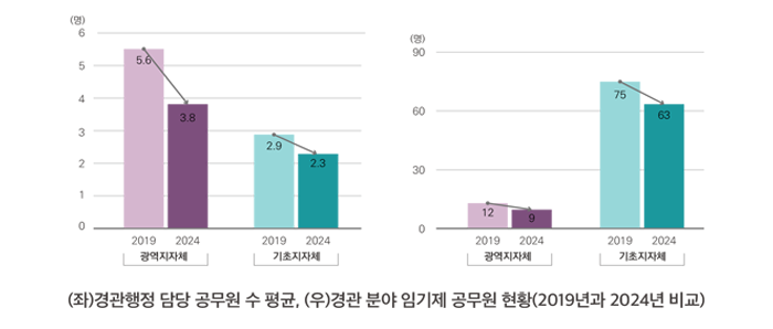 경관행정은 평균 광역지자체 3.8명, 기초지자체 2.3명이 담당하고 있는데 이는 2019년 대비 감소한 수치이다. 임기제(전문직) 공무원 수 역시 광역지자체 9명, 기초지자체 63명으로 2019년 대비 감소한 것으로 조사되었다.