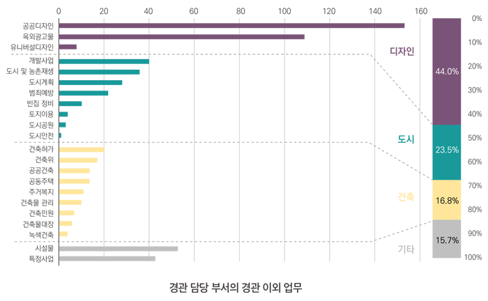 경관행정 담당 부서가 경관 이외 함께 수행하는 업무는 디자인(44.0%), 도시(23.5%), 건축(16.8%) 순으로 나타났으며, 세부 업무로는 공공디자인, 옥외광고물, 개발사업, 도시 및 농촌재생, 도시계획, 범죄예방디자인, 건축허가 순으로, 해당 지자체의 경관정책 방향성과 경관 업무 담당자의 전문 분야를 짐작할 수 있다.