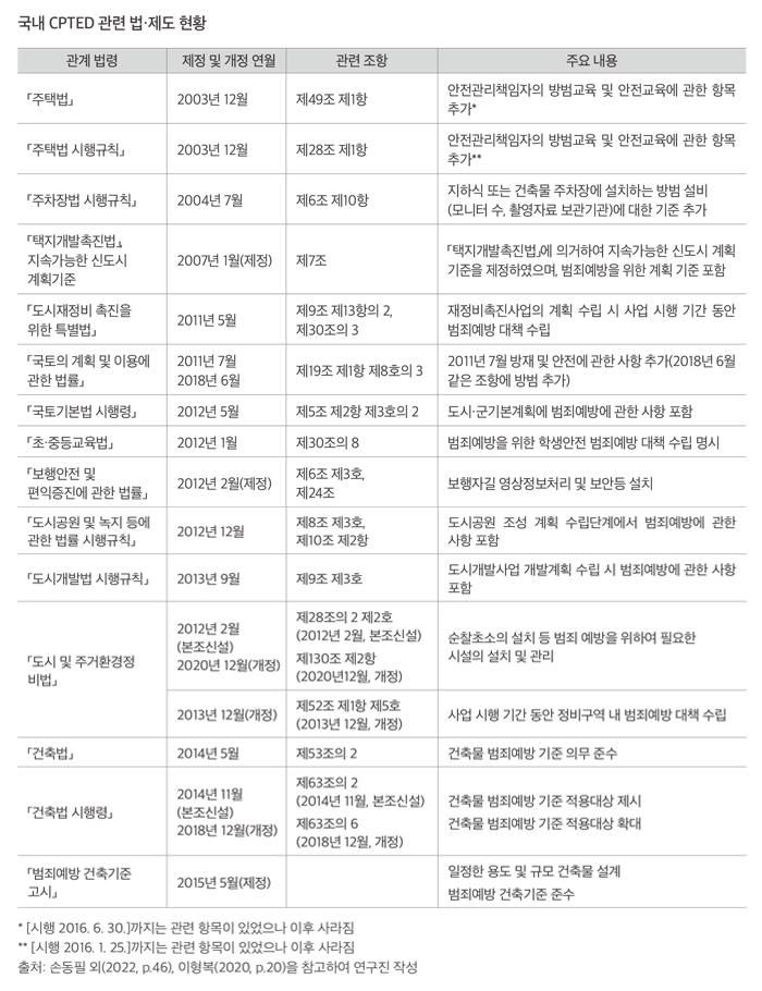 우리나라는 2000년도를 기점으로 범죄예방환경디자인(Crime Prevention Through Environ- mental Design: CPTED)에 대한 관심과 함께 제도적·정책적 측면에서 주요 항목으로 부각되기 시작하였고, 중앙부처를 중심으로 이를 제도화하기 위한 노력들이 진행되어 왔다(유광흠 외, 2014, pp.33-34).