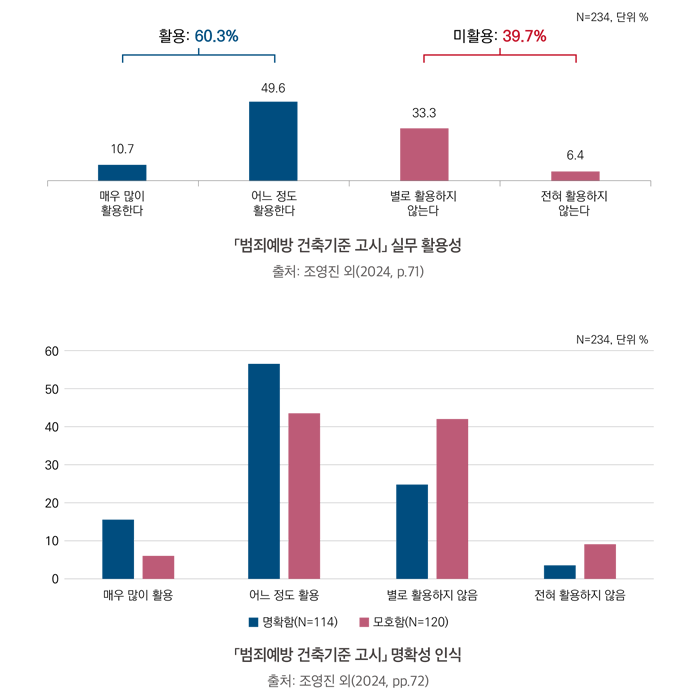 「범죄예방 건축기준 고시」는 건축 실무에서 범죄예방에 관한 가장 기초적인 자료로 활용되고 있으나, 추상적인 조문으로 인해 각종 민원이 꾸준히 발생하였다(조영진, 손동필, 2016, p.46). 실제 2024년 5월 실무자·공무원·전문가들을 대상으로 고시에 대한 인식 조사를 실시한 결과, 고시 활용 주체들은 「건축법」 제53조 2(건축물의 범죄예방)에 대해 인지하고 있는 비율이 60% 정도로 미비하고 실무 활용성도 비교적 낮은 것으로 나타났다(조영진 외, 2024, pp.73-74). 이처럼 「범죄예방 건축기준 고시」 조문의 문제, 고시의 제한적 활용 문제 등이 발생하고 있음에도 고시 전반에 대한 점검 및 개선 방향에 대한 논의는 부재한 실정이다. 고시가 제정된 지 10여 년이 경과한 현시점에서 실효성을 높이기 위한 구체적인 방안 등에 개정 방향에 대한 보다 근본적인 해법이 필요한 상황이다.