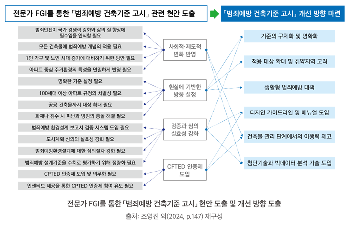「범죄예방 건축기준 고시」는 건축물의 범죄예방 성능 강화를 위해 도입된 법적 건축 기준이다. 하지만 실제 현장 실무자들의 의견을 수렴한 결과, 대체로 그 기준이 추상적이고 실무 적용이 어려워 활용성과 인지도 등 많은 부분에서 문제점과 한계가 있는 것으로 나타난다. 이에 현행 「범죄예방 건축기준 고시」의 현안 및 개선 방향을 도출하기 위해 각 분야 전문가를 대상으로 FGI를 실시하였으며, 이를 통해 도출된 주요 현안은 ‘사회적· 제도적 변화 반영’, ‘현실에 기반한 방향 설정’, ‘검증과 심의 실효성 강화’, ‘CPTED 인증제 도입’으로 정리할 수 있다. 그리고 이에 대한 개선 방향은 첫째, ‘기준의 구체화 및 명확화’, 둘째, ‘적용 대상 확대 및 취약지역 고려’, 셋째, ‘생활형 범죄예방 대책 반영’, 넷째, ‘가이드라인 및 매뉴얼 도입’, 다섯째, ‘건축물 관리 단계에서의 이행력 제고’, 여섯째, ‘첨단기술과 빅데이터 분석 기술 도입’으로 요약할 수 있다. 이와 같은 결과는 향후 「범죄예방 건축기준 고시」 개정 시 실제 해당 조문에 반영·배포됨으로써 현장에서의 활용성이 제고될 수 있을 것으로 기대한다.
