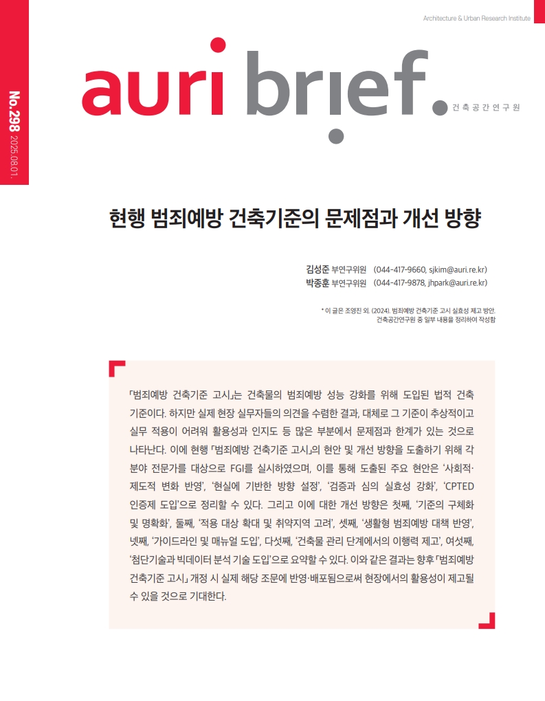 - 조영진, 김성준, 박종훈, 고영호, 임보영. (2024). 범죄예방 건축기준 고시 실효성 제고 방안. 건축공간연구원.