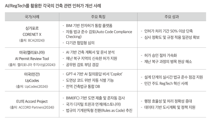 세계 주요국들은 AI와 레그테크(RegTech, 규제 극복을 위한 정보 기술)를 활용하여 복잡한 건축 인허가 절차를 자동화하고 행정 효율성을 높이는 혁신을 추진하고 있다. 각국의 사례는 법령의 디지털화, BIM 데이터 활용, 다기관 협업 플랫폼 구축을 통해 신속하고 정확한 건축행정을 구현하는 데 초점을 맞추고 있다.