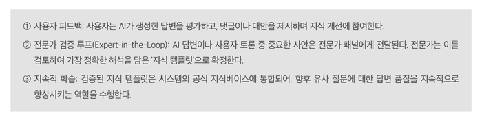 ALRIS는 AI의 자동화된 답변 생성에 인간의 집단지성을 결합하는 ‘하이브리드 인텔리전스’ 전략을 실험적으로 도입하여, 시스템의 신뢰성과 서비스 품질 향상을 추구한다. 이를 위해 새로 도입하는 기능 및 파이프라인은 다음과 같다.
