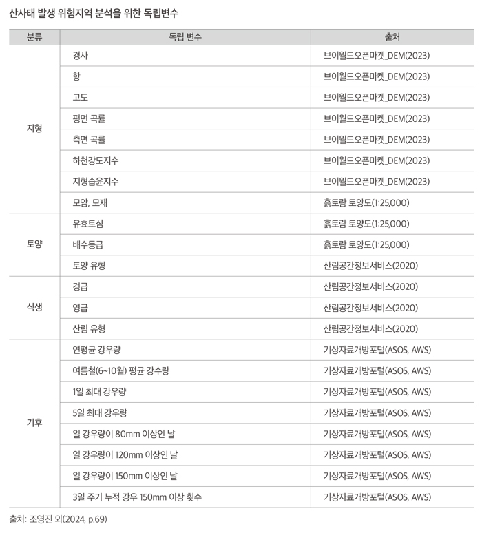 * 이 글은 조영진 외. (2024). 빅데이터 기반 건축물 산사태 리스크 분석 및 건축물 단위 재난 리스크 연계 방안 연구.