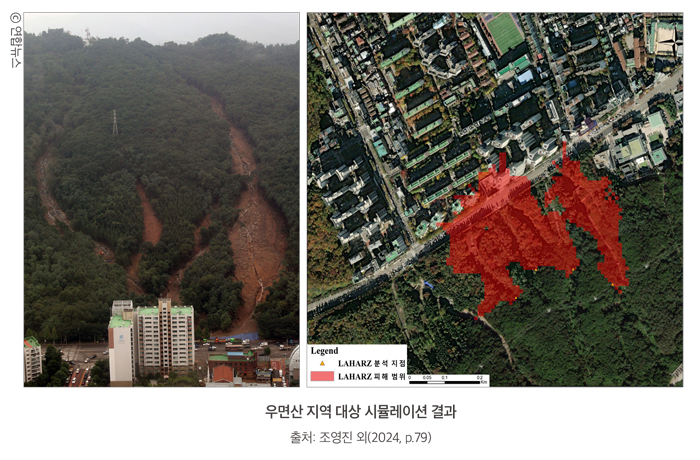 2011년 우면산 산사태를 계기로 산사태는 더 이상 산에서만 발생하는 재난이 아니라, 우리 집과 생활공간인 건축물을 직접 위협하는 문제라는 인식이 생겼다. 이에 이번 연구에서는 산사태가 일어날 가능성이 높은 지점을 찾고, 산사태 피해 범위를 시뮬레이션한 뒤, 그 영향권 안에 포함되는 건축물을 찾아내는 방식으로 건축물 단위의 산사태 위험을 분석하였다. 그 결과, 일부 지역에서는 산사태 발생 시 실제로 국민의 생활공간인 아파트와 주택이 피해를 입을 수 있는 것으로 나타났다.