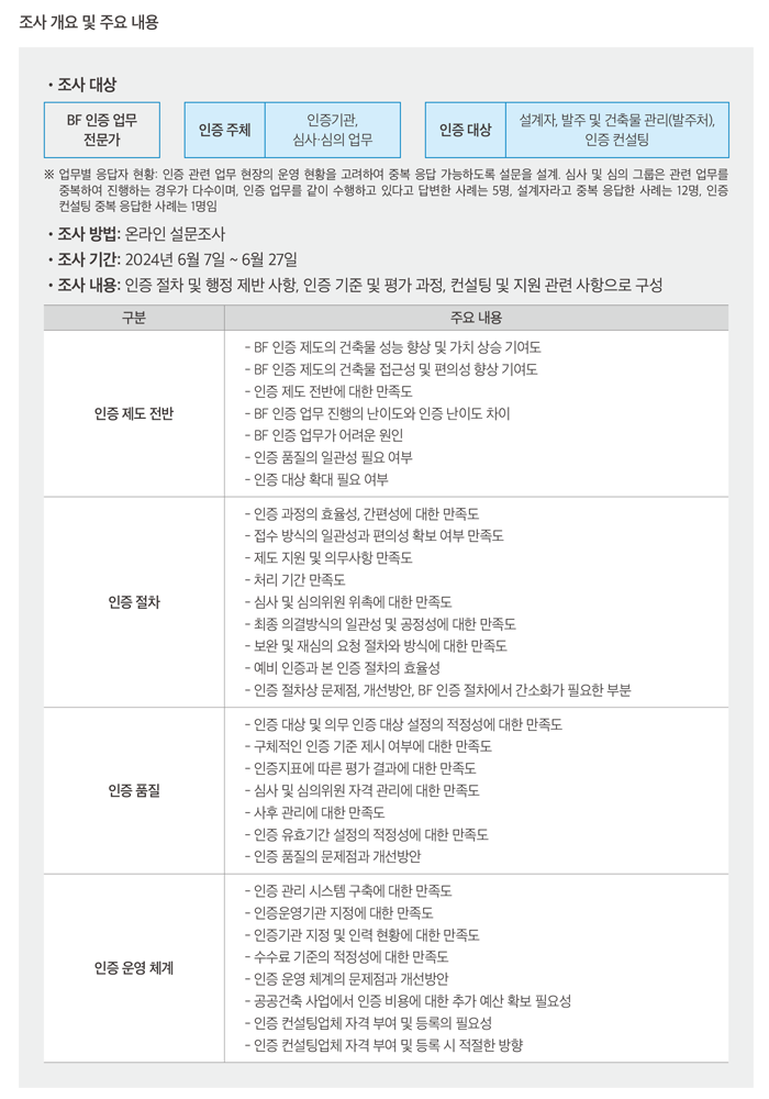 이러한 성과에도 불구하고, 인증이 이루어지는 현장에서는 인증 취득의 어려움을 호소하고 있다. 인증 취득에 과도한 기간 소요, 인증기관별로 인증 기준에 대한 상이한 해석 적용, 인증 범위를 벗어난 심의 의견 제시 등에 대해서는 지속적인 문제 제기가 있는 상황이다. 이에 이 글에서는 BF 인증 제도 운영에 대한 관계자 인식 조사를 통해 현장에서 겪고 있는 실질적인 어려움들을 확인하고, 이를 개선하기 위한 방향을 모색해 보고자 한다.