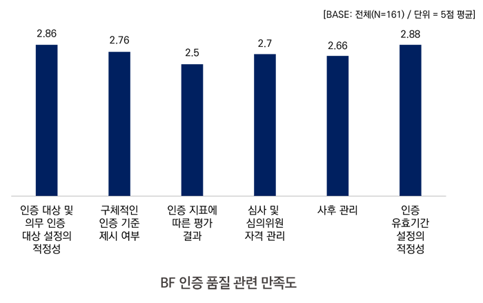 - BF 인증 제도의 접근성 및 편의성 향상 효과에 대해서는 긍정적 평가