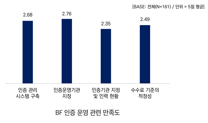 BF 인증 절차 관련 만족도는 보통 수준이다. 모든 그룹의 응답자들은 ‘처리 기간’에 대해서 1.97 이라는 가장 낮은 점수를 부여하였다. 특히 인증 컨설팅 분야 응답자들은 모든 항목에서 문제가 있다고 답변하였다.