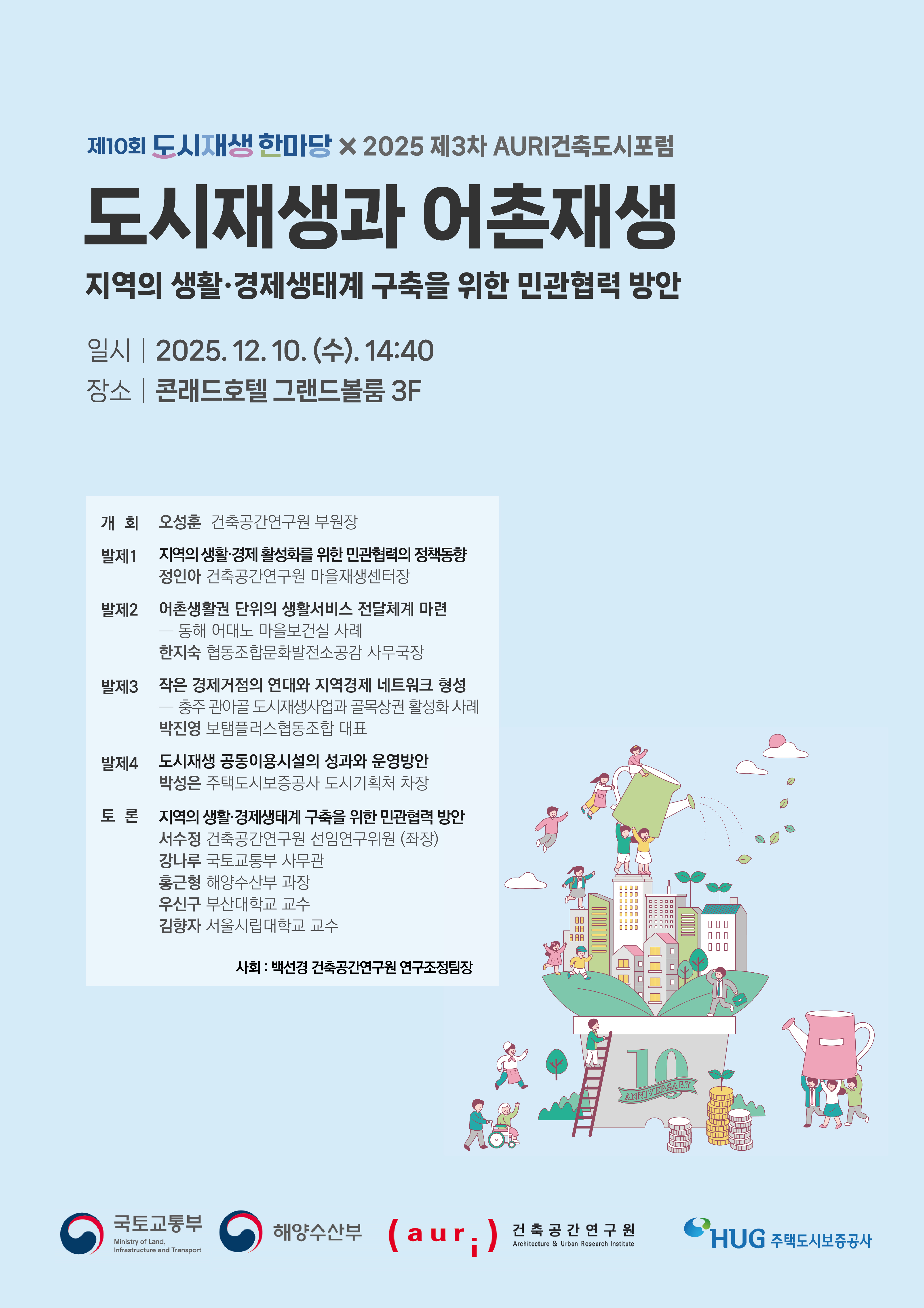 • 행사명 : 2025 제3차 AURI 건축도시포럼(제10회 도시재생한마당 세션2 연계) • 주 제 : 도시재생과 어촌재생 : 지역의 생활경제생태계 구축을 위한 민관협력 방안 • 일 시 : 2025년 12월 10일 (수) 14:40 ~16:20 • 장 소 : 서울 여의도 콘래드호텔 3층 그랜드볼룸 • 프로그램 식순 세부 내용 발제1 ⋅지역의 생활경제 활성화를 위한 민관협력의 정책동향 정인아..