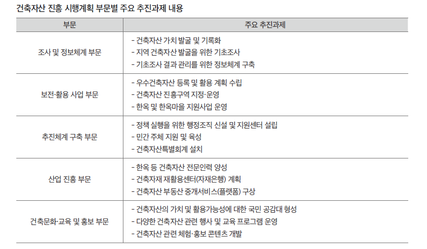 건축자산 진흥 시행계획 추진과제의 구성과 내용은 시·도마다 다르나 크게 다섯 가지 부문을 포함하고 있으며 이는 아래와 같이 구분해 볼 수 있다.