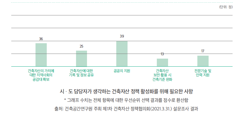 2) 제1차 건축자산 정책협의회(2021.3.31.)에 참석한 13개 광역지자체 건축자산 담당자를 대상으로 시행한 심층 설문조사의 결과이다.