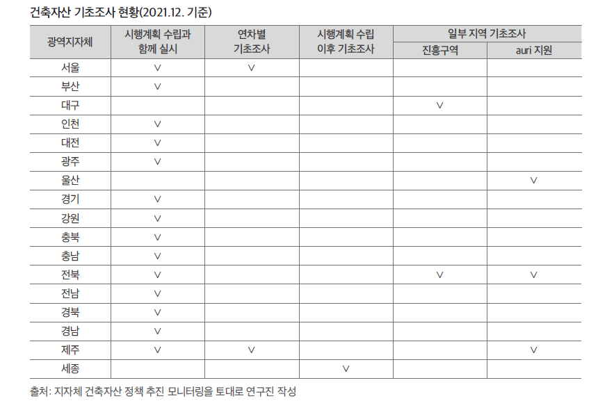 기초조사 수행 방법을 몇 가지 유형으로 나눠보면 가장 일반적인 것은 시행계획 수립 용역 시 기초조사를 포함하여 함께 시행한 경우로, 14개 광역지자체가 해당한다. 두 번째 유형은 시행계획에 연차별 기초조사 계획을 포함시킴으로써 시행계획 수립 과정에서뿐만 아니라 수립 이후에도 관할지역 전역에 대한 기초조사를 단계적으로 실시한 경우로, 서울과 제주가 이에 해당한다. 세 번째는 시행계획 수립 이후에 기초조사를 수행한 경우로, 세종은 예산 확보 문제로 시행계획 수립 용역 시 건축자산 후보군 목록 구축까지만 완료하고 이후에 기초조사를 완료했다. 이상이 시행계획 수립과 기초조사의 시점으로 분류한 경우였다면 네 번째 유형은 일부 지역에 한정해서 수행한 광역지자체로, 진흥구역 지정을 위해 기초조사를 실시했거나(대구 중구, 전북 군산, 익산) 건축자산 기초조사 활성화를 위해 건축공간연구원이 조사를 지원한 곳(울산, 전북 남원, 제주)이다.