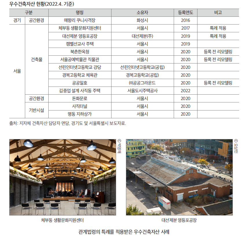 2022년 4월 기준 우수건축자산은 총 13개가 등록되었다. 전체 13개 우수건축자산 중에서 12개가 서울에 위치하여 우수건축자산이 아직은 전국적으로 확산되지 못한 상황이다. 그리고 대선제분 영등포공장과 공공일호(구 샘터사옥)를 제외하면 나머지 모든 우수건축자산은 공공소유로, 법률 제정 당시 취지와는 달리 소유자의 자발적 신청에 의한 등록은 미진한 실정이다. 또한 현재까지 관계법령의 특례를 적용받은 우수건축자산은 체부동 생활문화지원센터와 대선제분 영등포공장이 있다. 이들은 「국토의 계획 및 이용에 관한 법률」(이하 「국토계획법」)의 건폐율, 「건축법」의 대지의 조경, 건축선, 건축설비기준, 「주차장법」의 부설주차장의 설치 등에 대한 완화를 받았다.