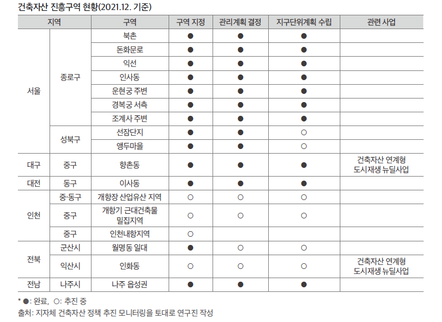 2021년 12월을 기준으로 건축자산 진흥구역은 모두 13개가 지정되었으며, 이 중에 군산시를 제외한 모든 구역에 대해 관리계획이 수립된 상태이다. 서울시는 한옥밀집지역으로 지정·관리해 온 9개 구역을 건축자산 진흥구역으로 지정하고 관리계획을 수립했으며, 해당 구역의 기정 지구단위계획에 대한 변경을 대부분 완료했다. 그리고 대구 중구 향촌동은 진흥구역 지정 및 관리계획·지구단위계획 수립 완료 이후, 건축자산 연계형 도시재생 뉴딜사업에 선정되어 건축자산 관련 사업을 진행 중이다. 이와 비교할 수 있는 사례로 전북 익산시 인화동의 경우에는, 건축자산 연계형 도시재생 뉴딜사업 선정 이후에 사업의 일환으로 진흥구역 지정 및 관리계획 수립을 추진 중이다. 또한 대전 동구 이사동과 전남 나주시는 민속마을 및 한옥마을에 해당하는 곳으로, 해당 지자체에서 이를 보다 체계적으로 지원·관리하기 위해 건축자산 진흥구역으로 지정하게 되었다. 한편 전북 군산시는 진흥구역 지정을 일찍이 완료하고 관리계획(안)도 마련했으나, 실행예산을 확보하는 데 어려움을 겪어 고시를 보류하고 있다.
