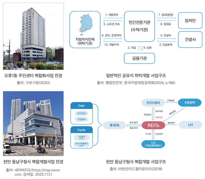 그동안 노후 공공청사 복합개발방식은 위탁개발을 통해 청사와 공공임대주택 등을 복합화하는 방식으로 추진되었다. 이 경우 공공청사 재건축 사업비는 위탁기관이 조달하고, 공공임대주택은 주택도시기금의 지원을 받기 때문에 국가나 지자체의 재정적 부담을 경감한다는 장점이 있다. 그러나 지역 및 해당 부지의 여건이 각기 다르고, 입지조건과 지역에 우선적으로 필요한 도입 기능 등도 다를 수 있으므로 보다 다양한 사업방식을 강구할 필요가 있다. 위탁개발과 1·2인 가구 위주 공공임대주택 공급의 단편적인 결합 방식에서 벗어나 리츠를 활용한 도시재생사업으로 추진한 동남구청사 복합개발 사례나, 민간투자사업이나 재건축 사업과 정기차지권을 결합한 일본의 사례처럼 여러 유형의 사업모델 개발과 제도적·행정적·재정적 지원방안과의 연계방식에 대한 고민이 필요하다.