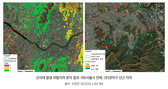분석 결과 서울시 전체를 산사태 발생 위험이 높은 지역으로 보기는 어렵지만, 산사태 발생 위험지역이 일부 분포하는 지역이 있었다. 상대적으로 산지가 많은 관악구 등이 이에 해당한다.