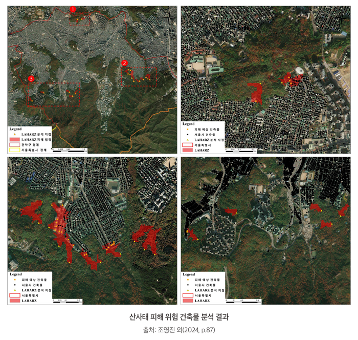 2011년 우면산 산사태를 계기로 산사태는 더 이상 산에서만 발생하는 재난이 아니라, 우리 집과 생활공간인 건축물을 직접 위협하는 문제라는 인식이 생겼다. 이에 이번 연구에서는 산사태가 일어날 가능성이 높은 지점을 찾고, 산사태 피해 범위를 시뮬레이션한 뒤, 그 영향권 안에 포함되는 건축물을 찾아내는 방식으로 건축물 단위의 산사태 위험을 분석하였다. 그 결과, 일부 지역에서는 산사태 발생 시 실제로 국민의 생활공간인 아파트와 주택이 피해를 입을 수 있는 것으로 나타났다.