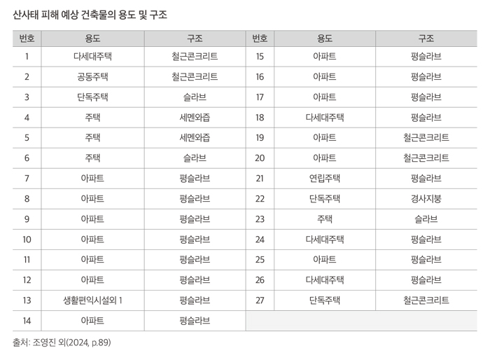 * 이 글은 조영진 외. (2024). 빅데이터 기반 건축물 산사태 리스크 분석 및 건축물 단위 재난 리스크 연계 방안 연구.