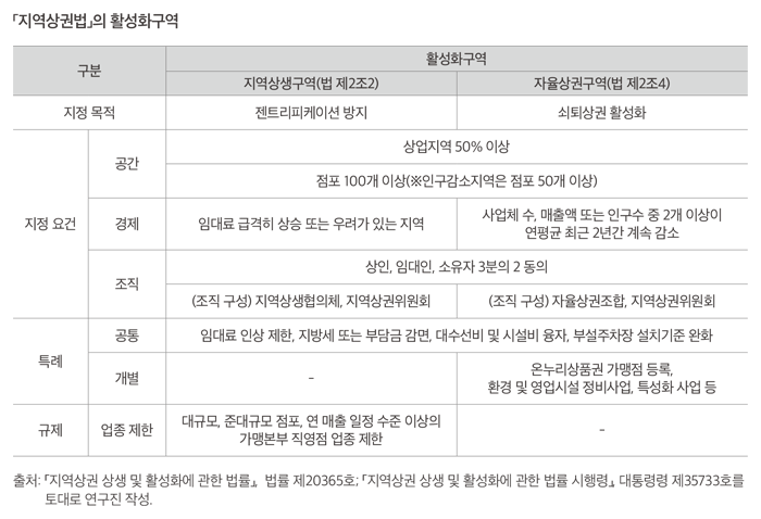 그간의 상권활성화 정책은 「전통시장법」에 의한 전통시장 및 상점가 활성화, 「도시 및 주거 환경정비법」에 의한 시장정비사업, 「유통산업발전법」에 의한 전통상업 보존과 대규모 점포 규제 등 개별 법률에 근거해 추진되어 왔다. 그러나 상권마다 적용되는 법률이 상이하고 지역 여건과 상권 특성을 고려한 종합적인 관리가 어려워 정책 사각지대가 발생하는 한계가 있었다. 이러한 배경에서 2021년 7월 제정된 「지역상권 상생 및 활성화에 관한 법률」(이하 「지역상권법」)은 업종, 업태, 규모 등 다양한 유통 형태를 포괄하며 지역 차원의 면 단위 공간관리를 지향한다는 점에서 의미가 있다.