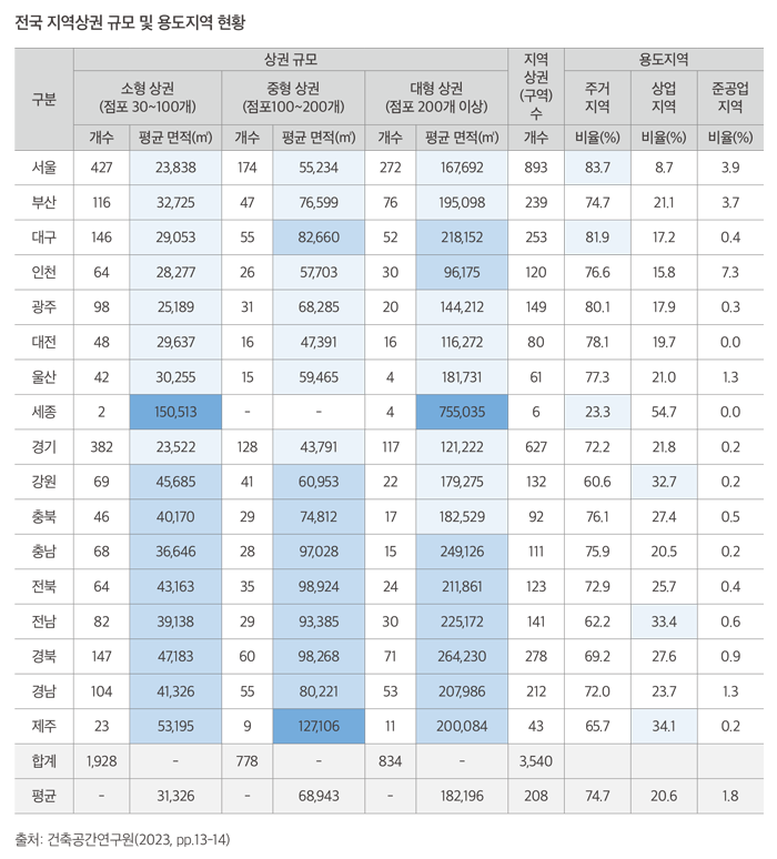 전국 지역상권의 규모는 소형 상권이 1,928곳(54.5%), 중형 상권이 778곳(30%), 대형 상권이 834곳 (23.6%)으로 나타났다. 지역별로 소형 상권은 특·광역시 및 경기도가 2만~3만㎡, 그 외 지역은 4만㎡ 대이며, 중형 상권은 특·광역시 및 경기도가 5만~7만㎡, 그 외 광역도가 6만~9만㎡, 대형 상권은 대체로 10만~20만㎡대로 나타났다. 이는 대도시의 경우 작은 면적 내 많은 점포가 밀집하여 상권을 형성하는 반면, 지방 중소도시는 넓은 면적에 점포가 낮은 밀도로 분산되어 형성하는 것을 의미한다.