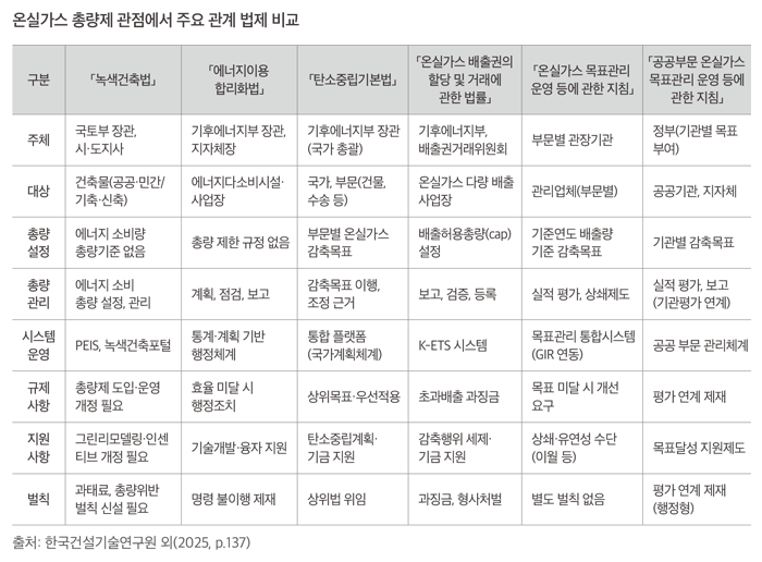 이런 점에서 볼 때, 「녹색건축법」은 건축물 에너지 소비 총량제의 도입과 운영을 위한 근거법으로 타당하다. 하지만 총량제를 시행한다고 했을 때, 현행 규정만으로는 부족하며 총량제 주체·대상· 지원·벌칙 등 세부사항에 대한 개선이 필요하다.